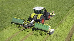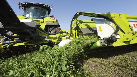 Til funktionen sammenlægning af skår er begge båndenheder klappet ned. Med DISCO 9200 C AUTOSWATHER dannes et perfekt kasseskår, som ikke mindst er meget velegnet i biomassehøsten. Det høje drejningsmoment på trækket af båndet giver mulighed for et lavt omdrejnings- tal.