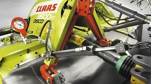 DISCO MOVE bevæger sig både vandret og lodret uafhængigt af traktorliften og sørger selvstændigt for hævningen af slåmaskinen. Det lave drejepunkt på knivbjælken til små ujævnheder i marken og MOVE kinematikken til store ujævnheder sikrer ideel tilpasning til terrænet – slåmaskinen kan bevæge sig hele 1000 mm op og ned. Den hydro-pneumatiske aflastning ACTIVE FLOAT, der kan indstilles under kørslen, er integreret i monteringsbukken som standard.