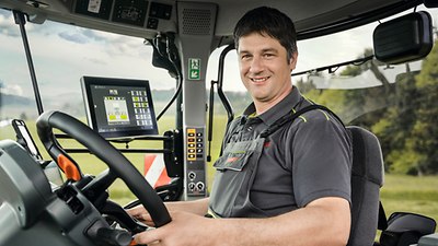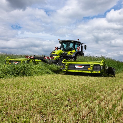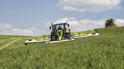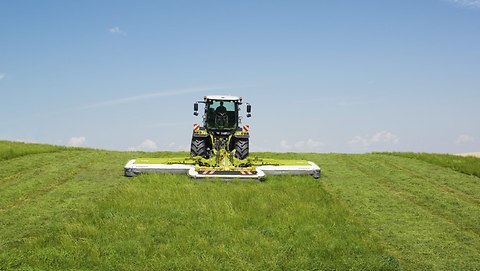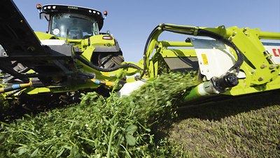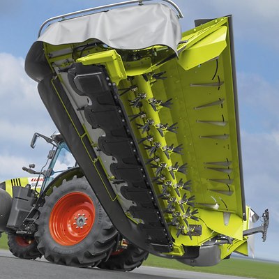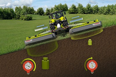 Ved hjælp af en hældningssensor på monteringsbukken til- passer marktrykket (ACTIVE FLOAT) og båndhastigheden sig automatisk til den aktuelle hældning. Ved behov kan den ønskede ændring af trykket afhængigt af hældningsgraden indstilles nemt på terminalen. Det aflaster føreren og forbedrer arbejdskvaliteten. Den ændrede friktionskraft modvirker afdriften på grund af hældningen positivt, så græstørven skånes. Resultatet er optimal form på skåret ved kørsel på tværs af hældningen og reduceret risiko for dannelse af striber eller tilsmudsning af foderet.